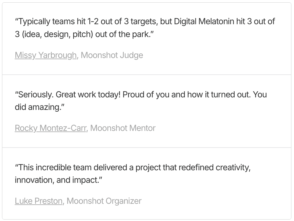 We collectively conducted 20+ student interviews, 5+ mentor interviews, and 1 professor interview to understand people’s bedtime routines, motivations, and pain points.