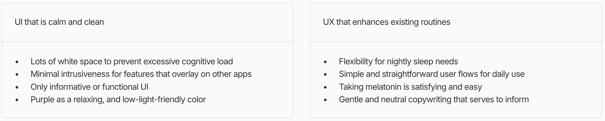 Melatonin heavily inspired our features because its characteristics (unintrusive, gradual, and taken case-by-case) addressed pain points with existing solutions. Here are our UI and UX goals.