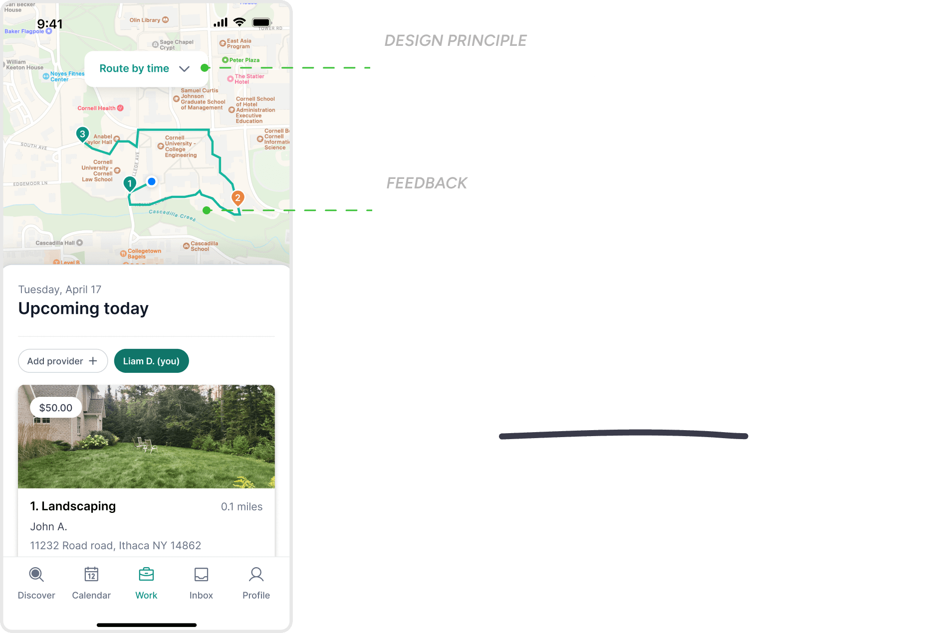 Providers organize their client work by day due to dynamic changes. Thus, to accommodate for these dynamic changes, I suggested a new post-scheduling feature that providers can use to plan out their route for the day.