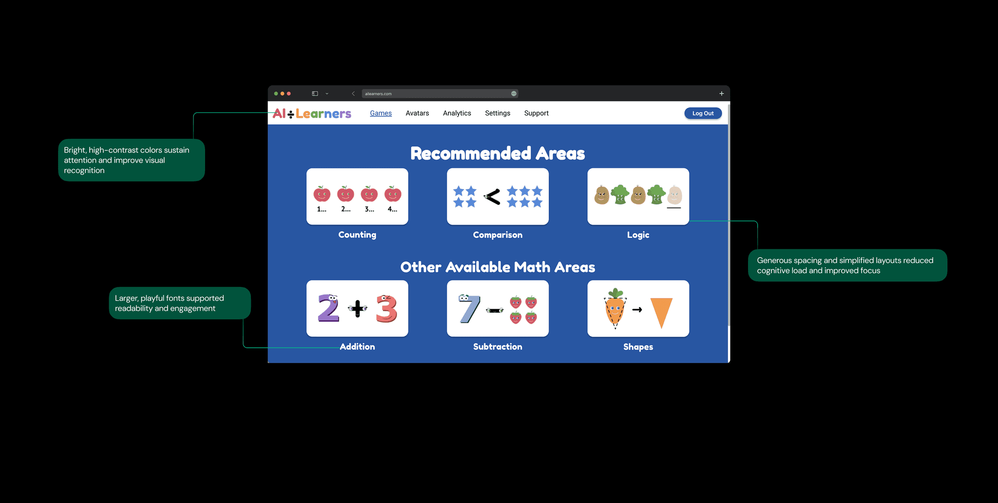 My collaboration with AI Learners gave me valuable experience designing for EdTech, particularly in creating accessible, analyticsfor students of all abilities. This project was a meaningful design challenge, offering a chance to work on personalized learning analytics that support both students and instructors in real classroom and at home settings.
