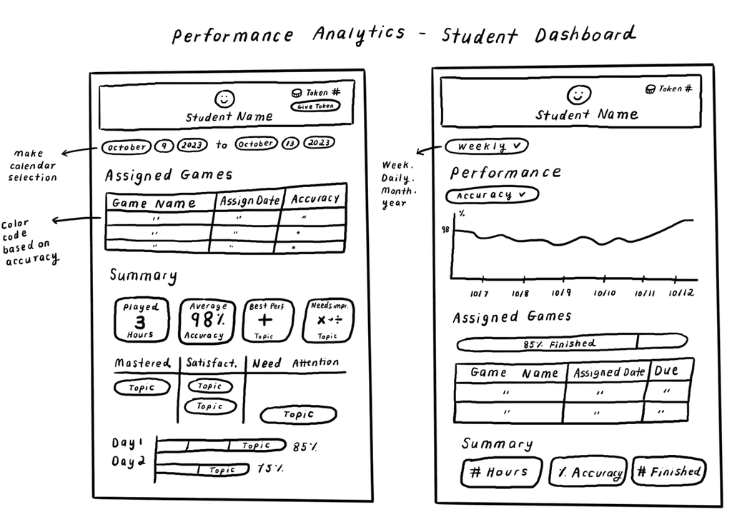I sketched low-fidelity wireframes to quickly explore multiple ways to present student progress, track game analytics, and support seamless dashboard flow.