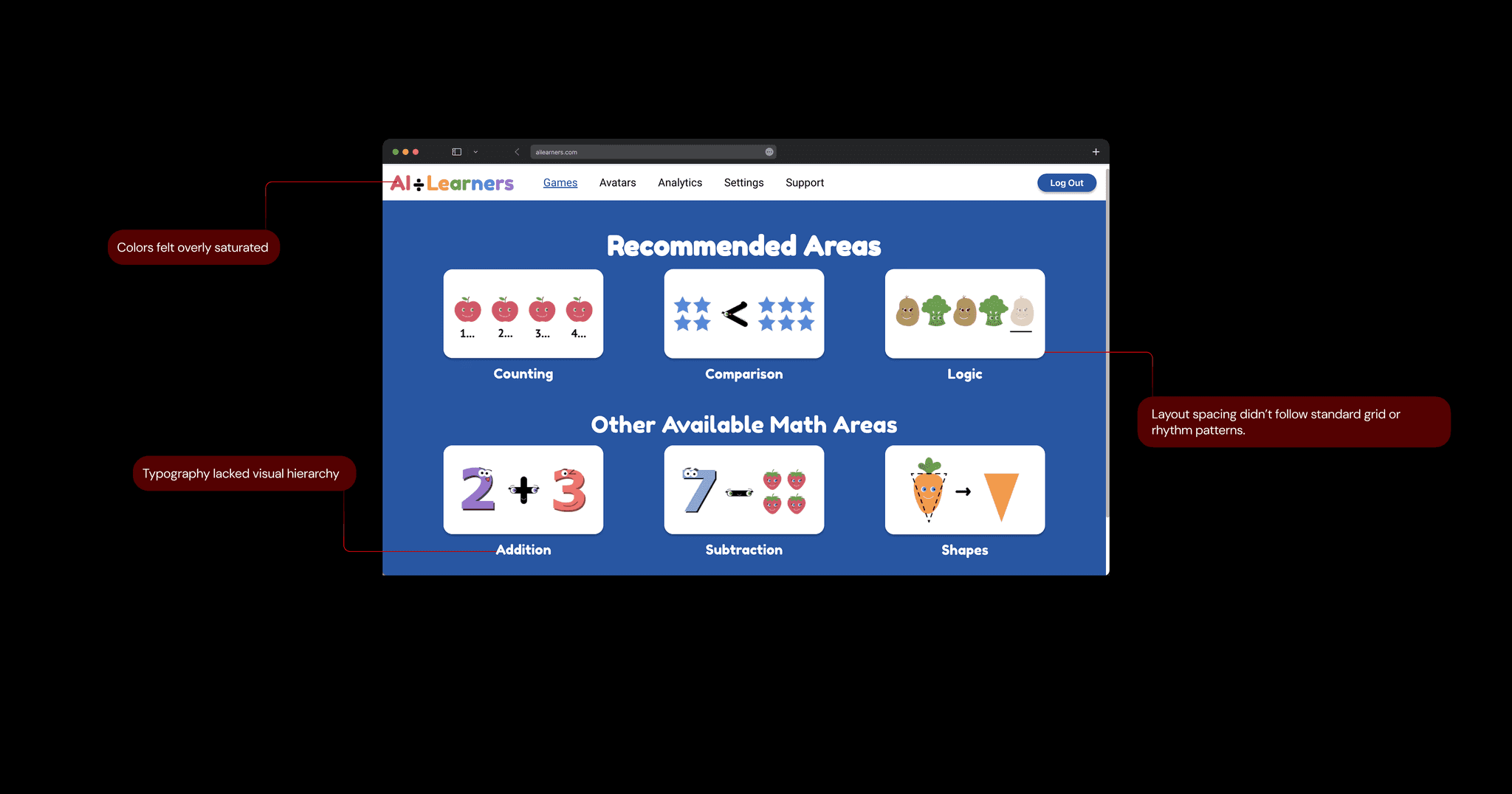 This project was not a redesign of the UI. As a contract designer, my scope was limited to adding new analytics features, specifically to the Student Progress Dashboard and progress-tracking tools. While our team identified several opportunities to improve overall usability and visual consistency, we were told to focus on strictly building upon the current design system to ensure our work aligned with the company’s existing product architecture and technical constraints.