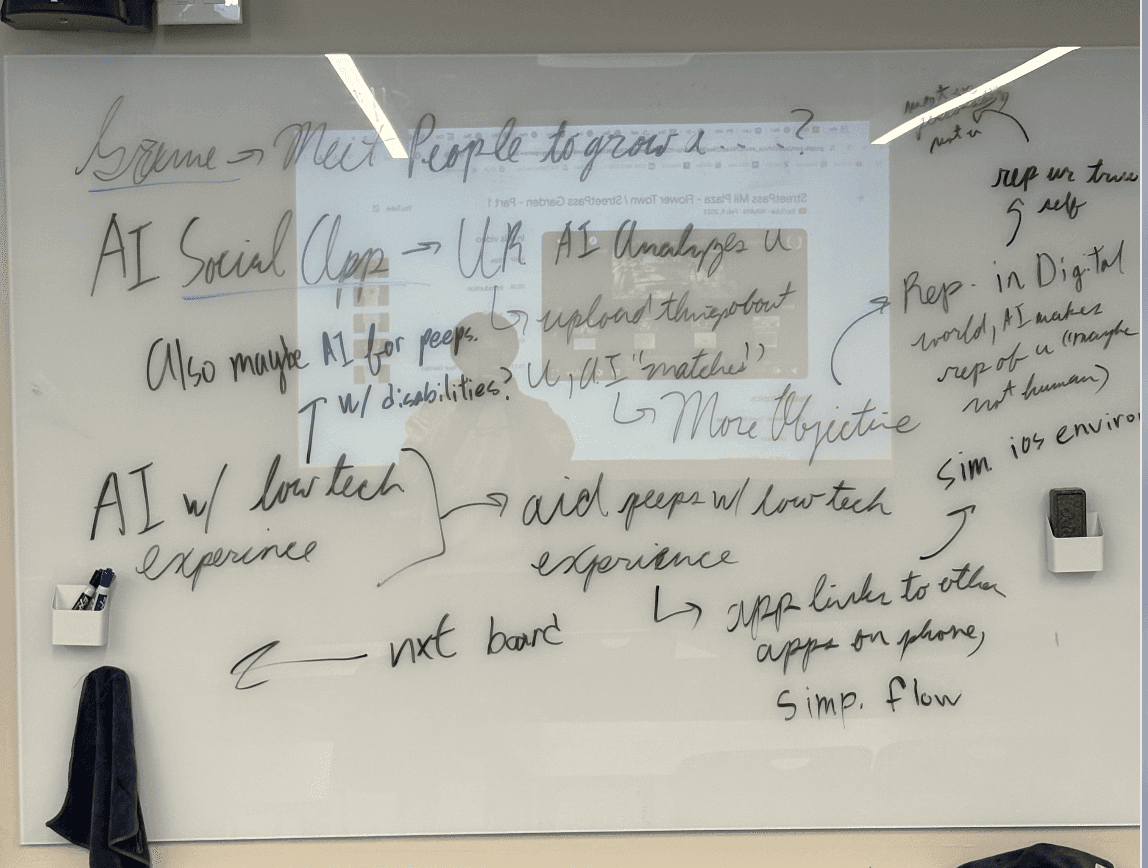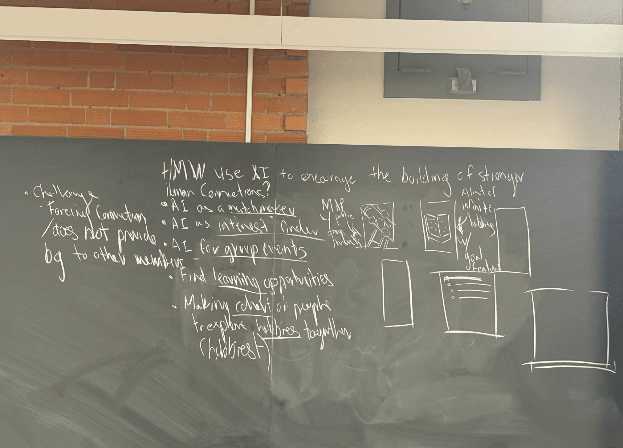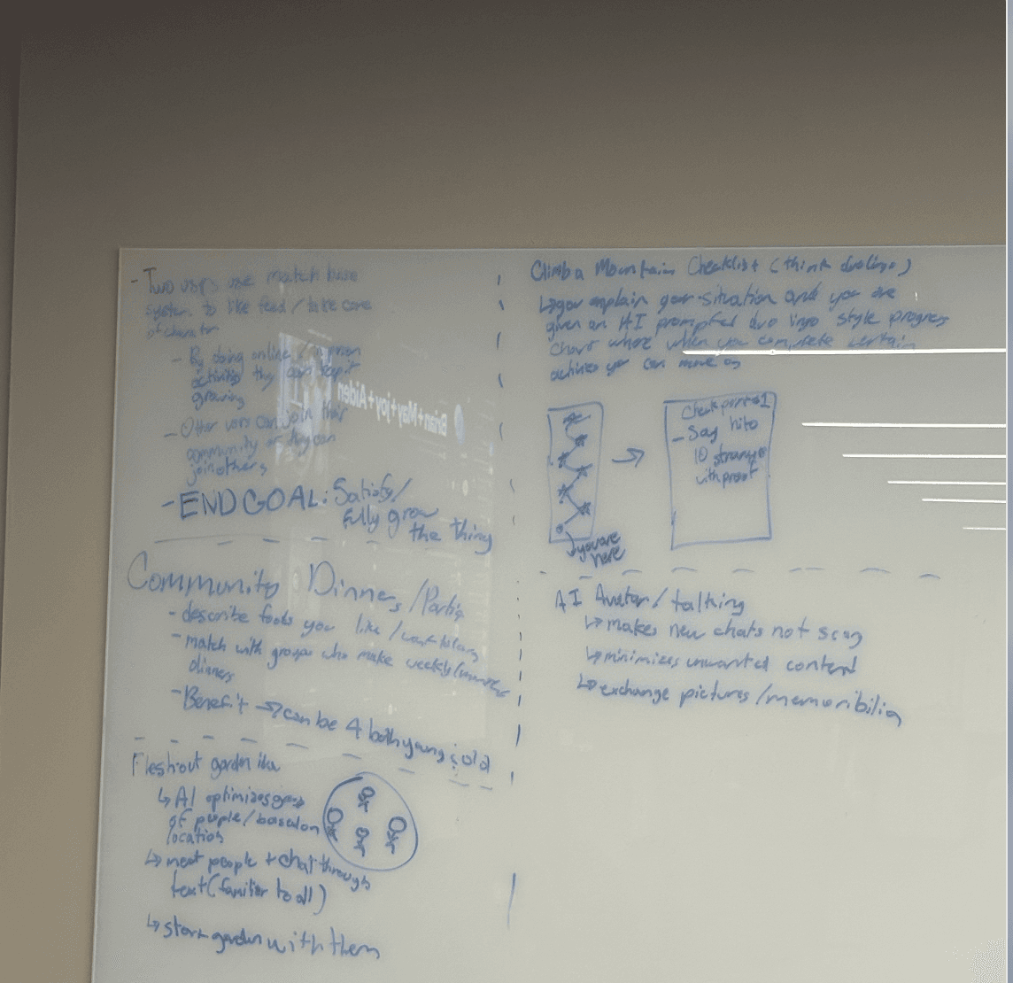 With our research in mind, we dedicated an entire day to brainstorming, filling whiteboards with sketches, notes, and mind maps. Our goal was to translate what we learned about human connection into tangible design ideas. We encouraged open exploration, pushing past first thoughts to uncover concepts that truly reflected authenticity and empathy.